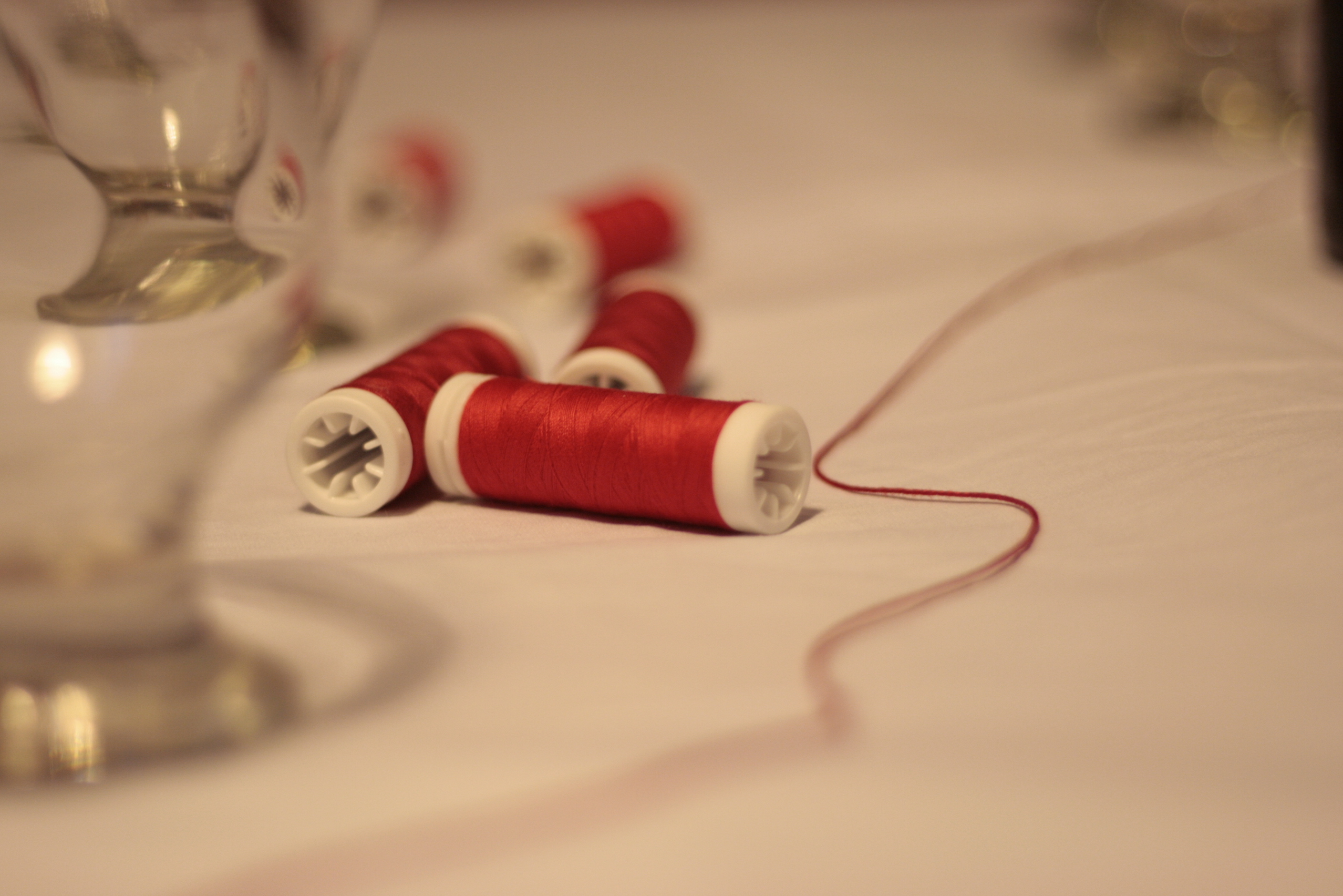 Copas vacías, medio llenas, dos botellas de tinto vacías, bobinas de hilo rojo.