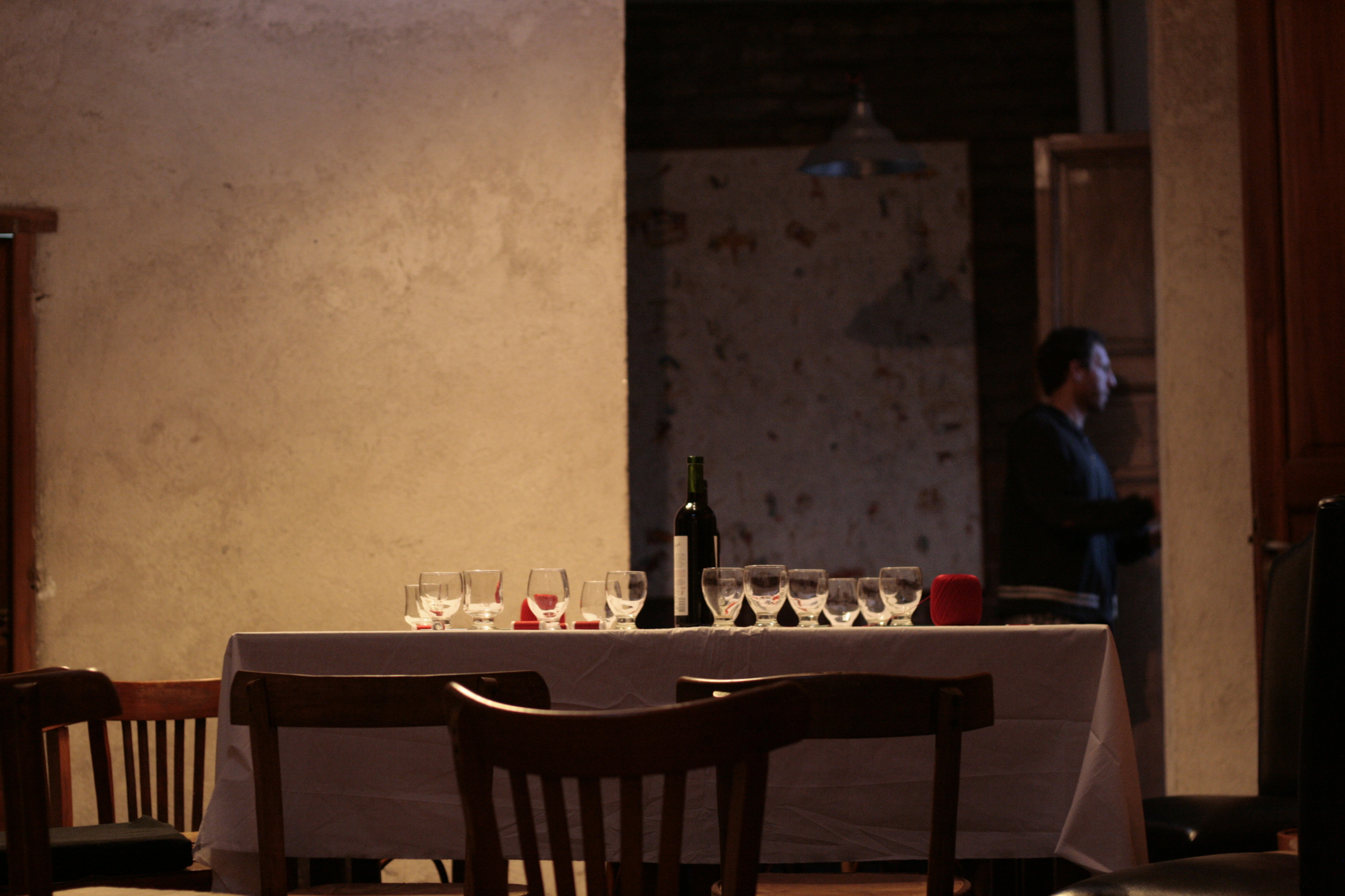 Seguindo até a cantina a pessoa encontrava uma mesa coberta por um tecido branco e copos, vinhos, diferentes tipos de linhas vermelhas, agulhas, lápis, tesouras e um caderno de anotações vermelho.