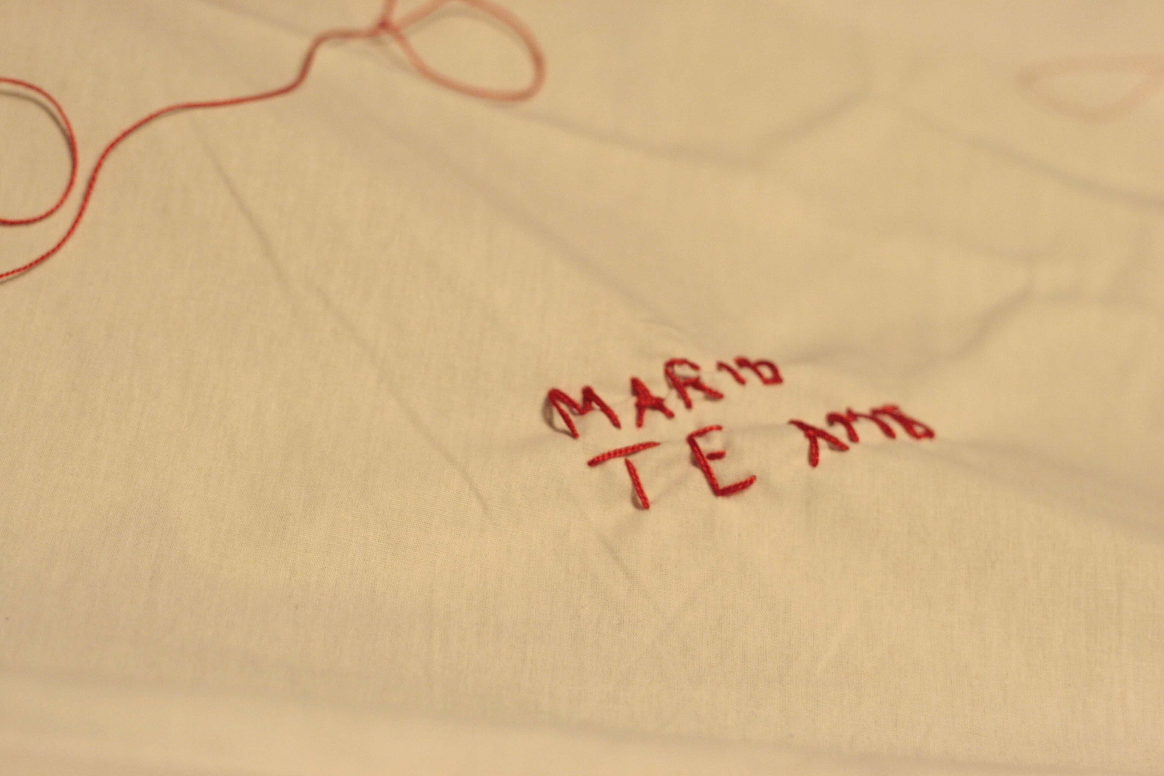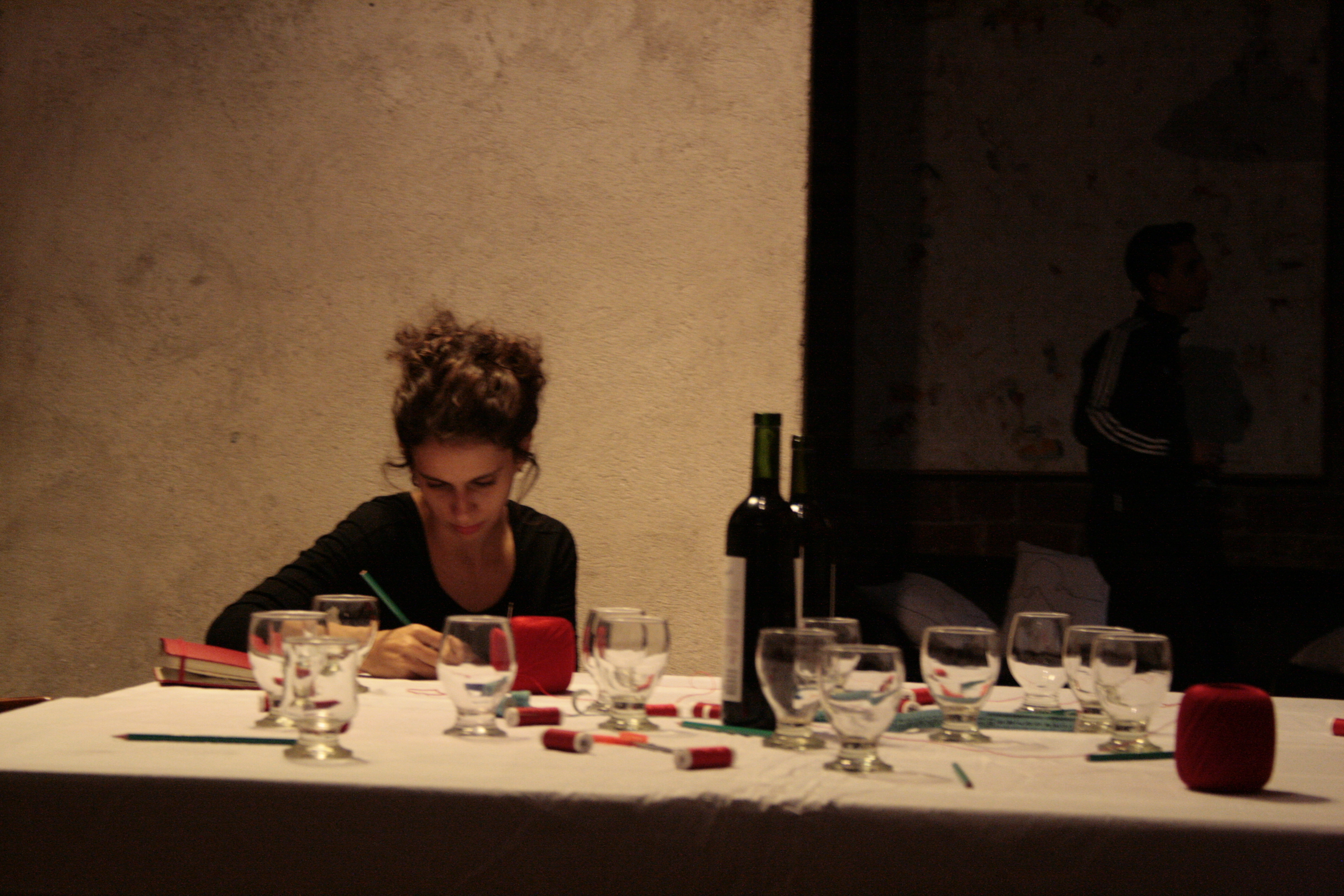 ¿Se puede criticar a un grupo de personas bordando amor, sensaciones de amor, gestos de amor en una mesa, compartiendo vino tinto? ¿Qué sucede cuando el artista no es el que hace sino el que propone una acción para que otros realicen? ¿Es un taller de bordado? Sí lo es su dinámica: una propuesta, lo grupal. Sin embargo no la cadencia auditiva. La música de fondo, la conversación suave, las copas con la botella de vino que queda y lo que generan; el ahora mantel (instalado sobre una mesa), luego será una gran pieza textil que nadie se llevará a su casa, sino una obra de la artista que propuso el hacer amoroso. Nadie pone su nombre: todos son artistas con acción de bordado anónimos y todo es una obra de Talma Salem. No por apropiación. “El autor intelectual” y los seguidores del clan. “Nuestro work in progess”.