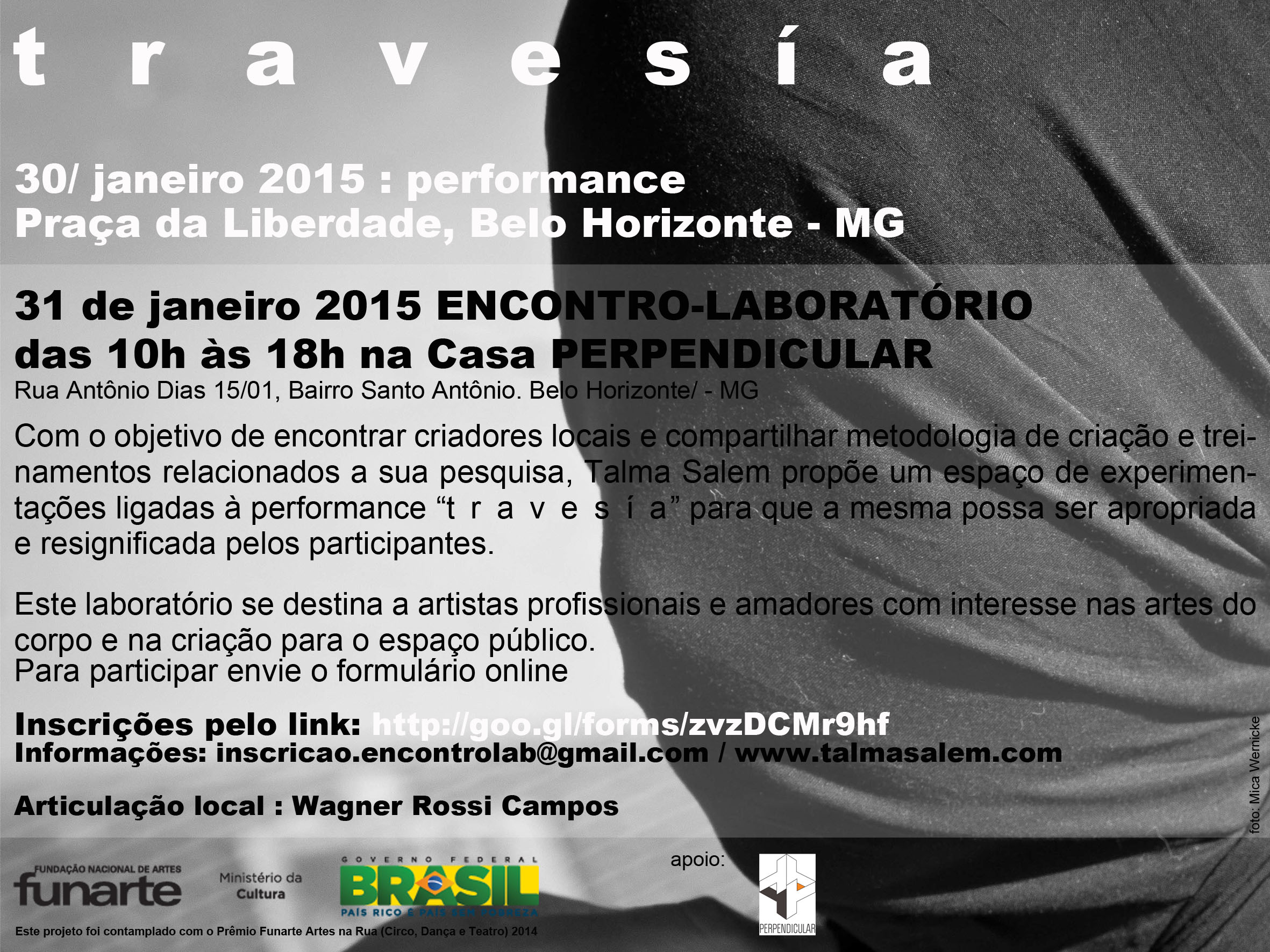 Com o objetivo de encontrar criadores locais e compartilhar metodologia de criação e treinamentos relacionados a sua pesquisa, Talma Salem propõe um espaço de experimentações ligadas à performance “t r a v e s í a” para que a mesma possa ser apropriada e resignificada pelos participantes. Este laboratório se destina a artistas profissionais e amadores com interesse nas artes do corpo e na criação para o espaço público.