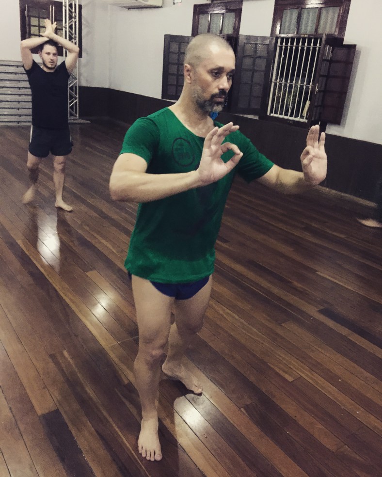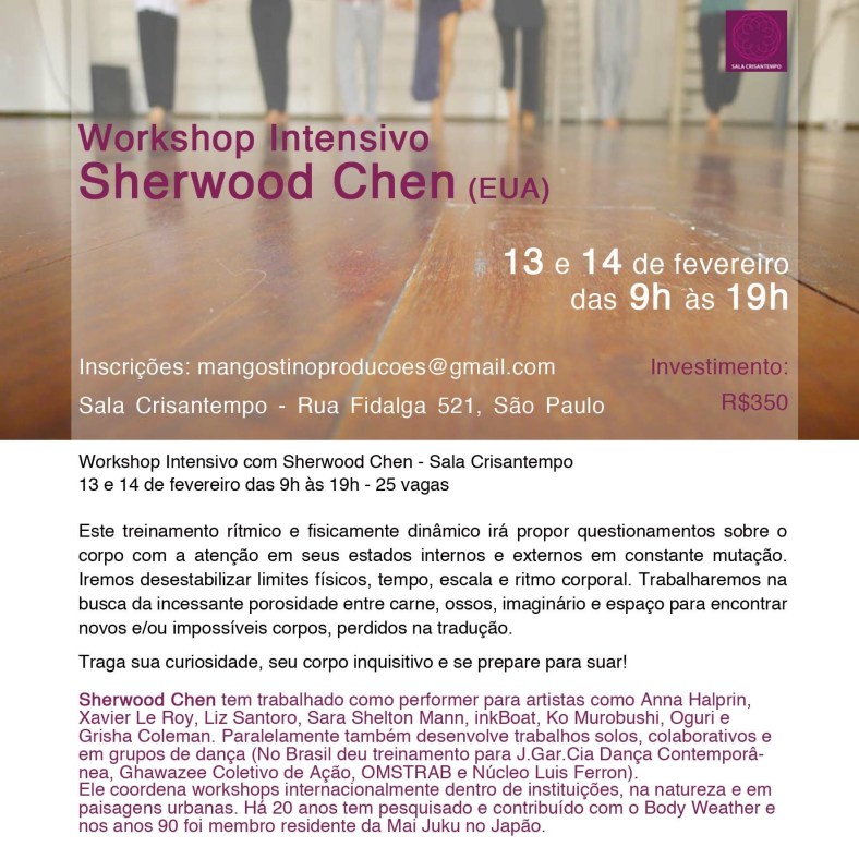 Desde 2011 venho desenvolvendo uma parceria com o artista americano Sherwood Chen articulando workshops e treinamentos ministrados por ele na cidade de São Paulo. Neste ano, pela primeira vez trabalhamos em instituições culturais e não somente em espaços independentes. Realizamos workshop de Body Weather com 1 semana de duração na Oficinq Cultural Oswald Andrade, intensivo imersivo para performers na Sala Crisantempo (ambos m São Paulo) e workshop de Body Weather no SESC ARSENAL em Cuiabá.